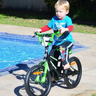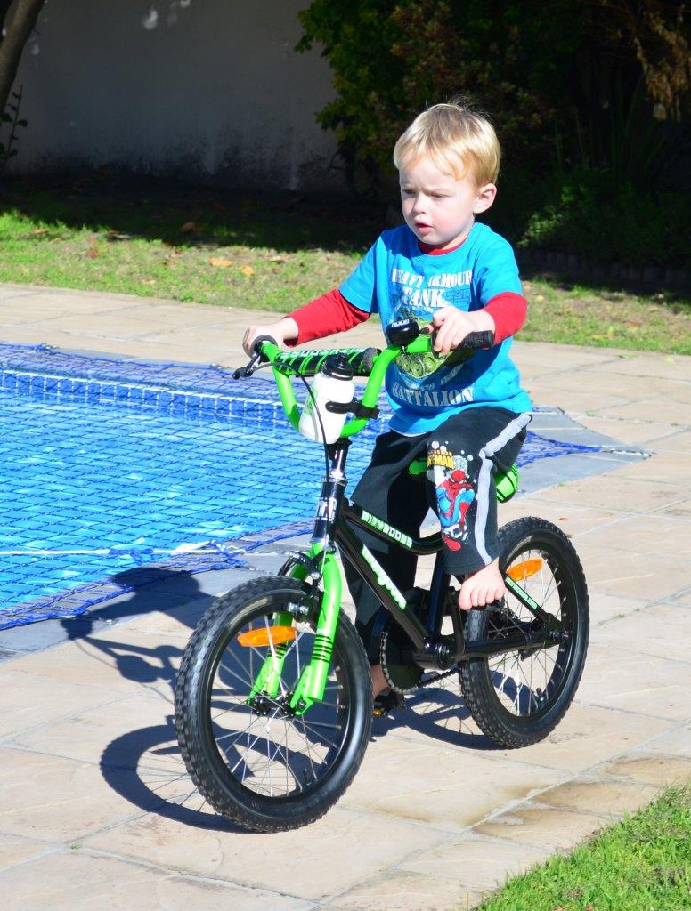 Mity GooseOnce we were back in Cape Town we gave Dylan his new bike the “Mity Goose” as his big present from us.  He loves the bike and immediately took it for a test ride around the pool.  It has a water bottle and a bell which comes in handy when we come up behind slow pokes in the forest.  The “Mity Goose” which I suppose stands for Mighty Goose is a 16 inch mongoose kiddies bike.  It is quite a bit bigger than the 12 inch bike that he has been using which makes it easier for him to keep up with us.